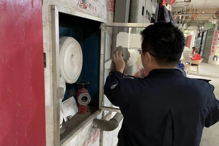 清潔市場1-3樓消防栓。管理人員用抹布對內頂壁、內立面、軟管水槍、管道、分解水龍頭、閥門、底部平面等等進行抹塵、擦拭、去污,最后對消防栓玻璃進行擦洗,清潔的同時對火警警報器是否正常進行檢查,此次總共清潔消防栓102只。