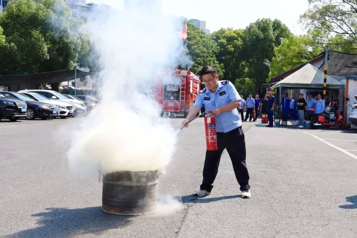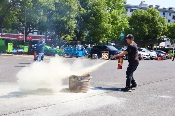演練分為兩個項目,首先是手持滅火器撲救油桶火災,參與者們在專業指導下迅速而準確地使用滅火器將火焰撲滅,展示了高效的個人應急反應能力。緊接著是兩人協作的水帶連接出水打靶環節,這一項目考驗了團隊之間的配合以及對消防設備的操作熟練度。